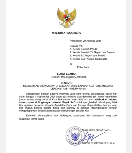 Surat Edaran Walikota Pekanbaru, Nomor 400.3/Disdik/2791/2025, tentang meliburkan siswa siswi di sekolah dikarenakan ada rencana aksi demonstrasi atau unjuk rasa dalam jumlah massa yang besar di Kota Pekanbaru.
