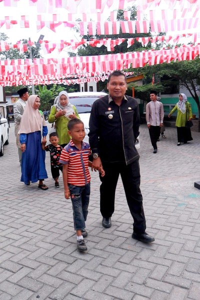 Camat Kulim, Fajri Adha didampingi Pelaksana Tugas (Plt) Lurah Pematangkapau, Nugrah Ditio Ramadhan dan kader posyandu Pematangkapau, mengantarkan langsung ke SD Negeri 133 Pekanbaru.