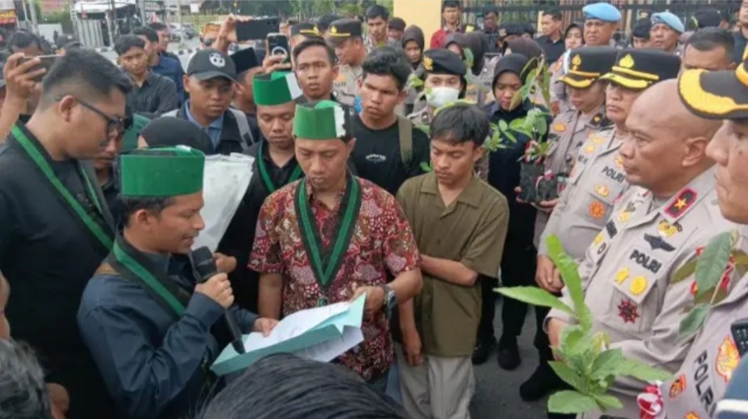 Ketua Umum Badko HMI Riau-Kepri, Wiriyanto Aswir, bahkan tak kuasa menahan haru saat menyampaikan apresiasinya di depan Mapolda Riau, Selasa (2/9/2025).