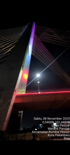 Detil.co,Pekanbaru - Untuk memberikan rasa aman kepada warga saat melintas di malam hari, serta menambah keindahan kota yang juga nantinya dapat menarik wisatawan, Dinas Perhubungan (Dishub) Kota Pekanbaru memasang lampu hias di jembatan Siak IV. Pemasangan sejumlah lampu hias dimulai sejak Jum'at (7/11/2025) malam, dan kini pemasangan lampu hias sudah tuntas dilakukan.