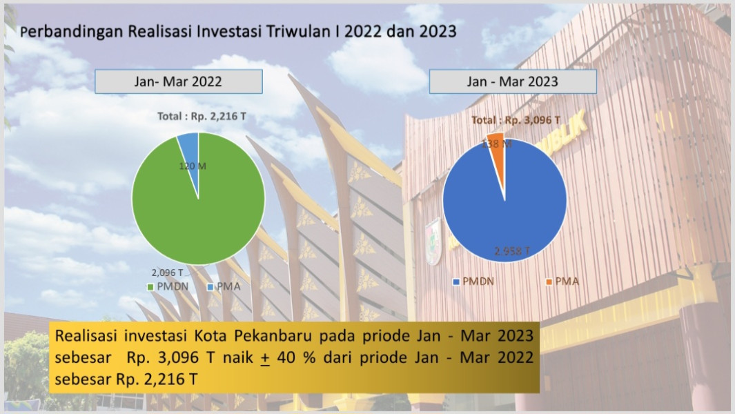 "Dibandingkan capaian Triwulan I periode Januari - Maret 2022, sebesar Rp 2,216 triliun, dengan rincian, PMDN sebesar Rp 2,096 triliun dan PMA Rp 120 miliar, realisasi investasi kota Pekanbaru pada periode Januari - Maret 2023 yang mana sebesar Rp 3,096 triliun, mengalami kenaikan sebesar 40 persen," ujar Norpendike.