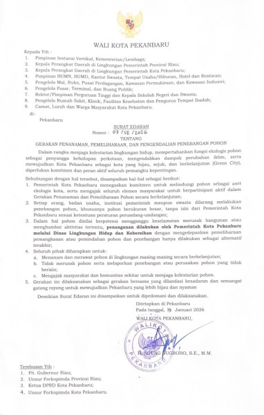 "Setiap orang, badan usaha, institusi pemerintah maupun swasta dilarang melakukan penebangan pohon, khususnya pohon berukuran besar, tanpa izin dari Pemerintah Pekanbaru sesuai ketentuan peraturan perundang-undangan," bunyi poin ke-2 dalam SE dimaksud.